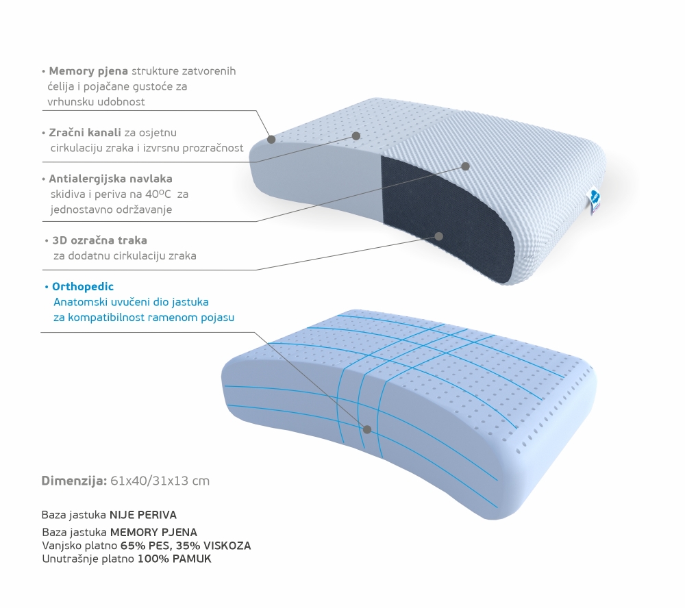 - Izrađeni od visokokvalitetne memory pjene, anatomski oblikovane za stavljanje glave u odgovarajući položaj za spavanje kako bi se izbjegli negativni efekti okretanja i traženja idealne pozicije tokom spavanja.